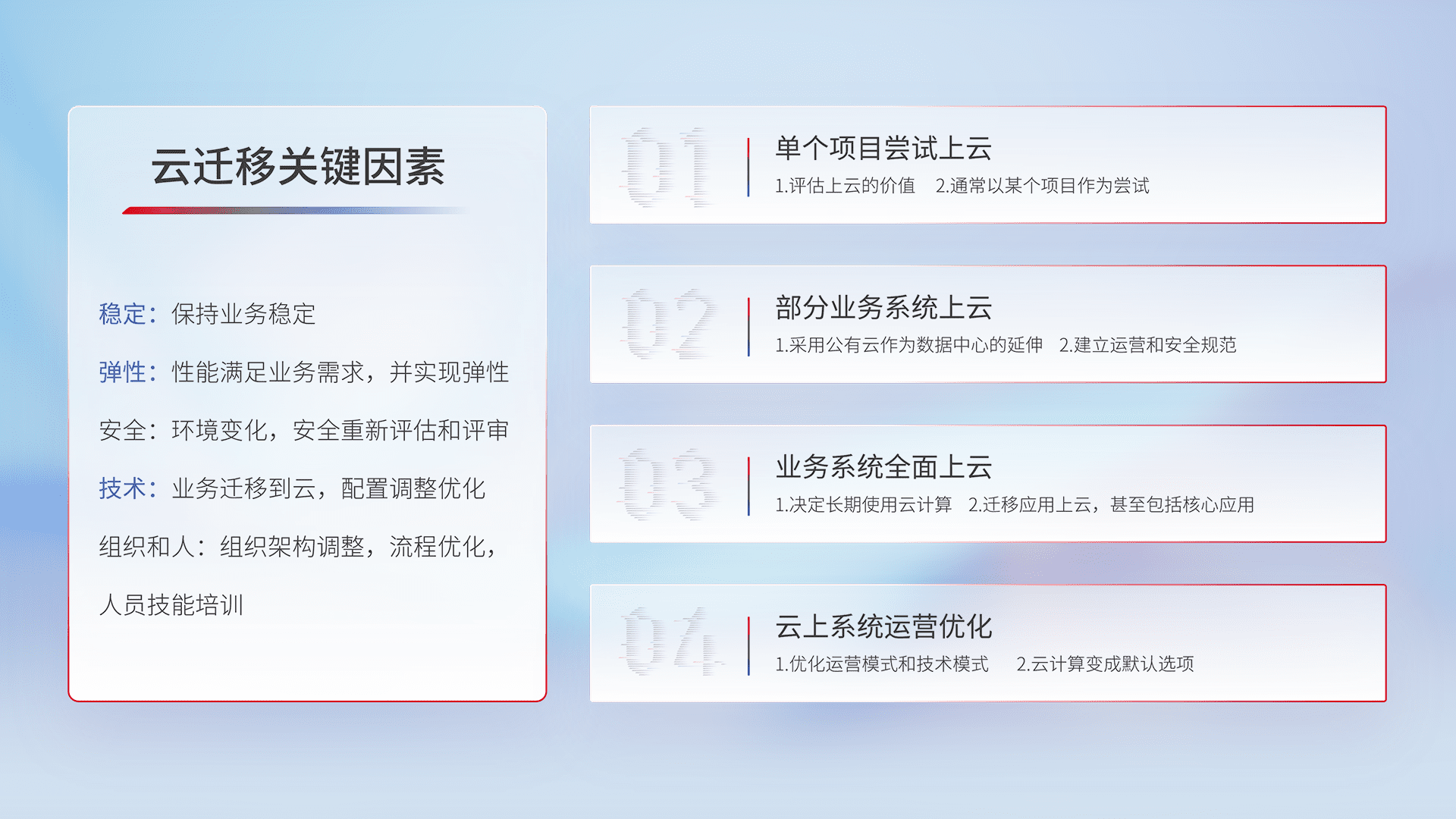 结合实际业务,,,,从规划设计、、云平台选型、、、云原生改造、、数据迁移、、集成交付,,,,迁移全过程为客户识别最佳上云路径,,做好风险识别管理,,,,设计网络架构、、、、身份权限、、安全审计合规、、操作审计、、、日志审计、、监控告警策略、、、、多站点容灾设计等,,,,对云上基础设施进行整体规划,,,,提升IT治理水平,,,,以满足弹性、、、、高可用、、、、高性能的需求。。。。