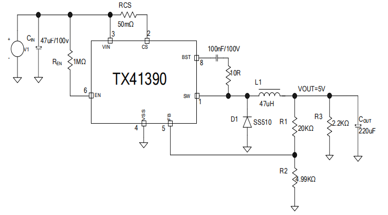 TX41390 通过设置FB引脚的分压电阻可设置输出恒压值。。。。